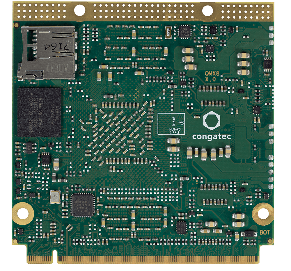Qseven module with high-performance NXP i.MX8 Quad Max processor with 2x ARM® Cortex®-A72, 4x ARM® Cortex®-A53 and 2x ARM® Cortex®-M4F, 4GB onboard LPDDR4 memory and 16GB onboard eMMC. Lidded package. Industrial temperature range.