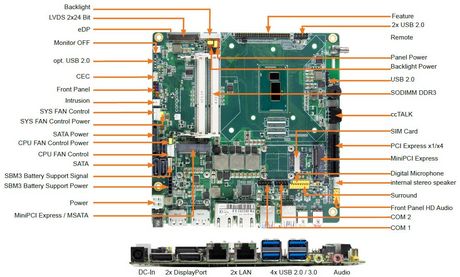 The Core i-series processors support AES-NI hardware encryption and AVX2 accelerated vector multiplications; the i5 and i7 processors additionally support Turbo Boost Technology 2.0 clock speed acceleration, AMT9.5 management functions and Trusted Execution Technology (TXT). While the Intel Celeron HD Gen7 graphics only supports standard features, the powerful HD4400 (i3, i5) and HD5000 (i7) graphics enable demanding graphics processing up to frequencies of 1000 MHz (Celeron, i3) and 1100 MHz (i5, i7). All processors support up to three independent displays with up to 2,560 x 1,600 pixel resolution with DisplayPort.The hardware supports or directly accelerates DirectX 11.1, OpenGL 3.2, OpenCL 1.2 plus high-performance, flexible hardware decoding to decode multiple high-resolution full HD videos in parallel. Two DisplayPort connections (DP++) are located on the back of the board; they are internally connected via DISP in line with the Thin Mini-ITX specification. If necessary, an additional DisplayPort (eDP) and 2x24 Bit LVDS connector are available. There are also two SODIMM sockets that can be equipped with up to 16 GB SODIMM DDR3L memory. Four USB 3.0 SuperSpeed ports (backward compatible with USB 2.0) are directly available on the back of the board, four more USB 2.0 ports can be connected via an internal interface. A total of two 5 Gb/s PCI Express 2.0 lanes can be used as 1x mPCIe Half Size, 1x PCIe Full Size (shared with PCIe x1 and mSATA) and 1x PCIe x1 (shared with mSATA/mPCIe). Four SATA interfaces with up to 6 Gb/s (one of them realized as mSATA) plus a mini PCIe and SIM card slot allow quick and flexible system extensions. Two Intel I210 Gigabit Ethernet controllers each provide one Gigabit Ethernet LAN access via the two RJ45 sockets. ACPI 5.0, I2C bus and LPC bus allow easy integration of legacy I/O interfaces. An optional security module (TPM), real-time clock (RTC), Intel high-definition audio and a universal power source with 12 to 19 volts (optional 6 to 24 volts) complete the feature set. For additional features please refer to the block diagram shown in Figure 3 and the interface overview (Figure 4).